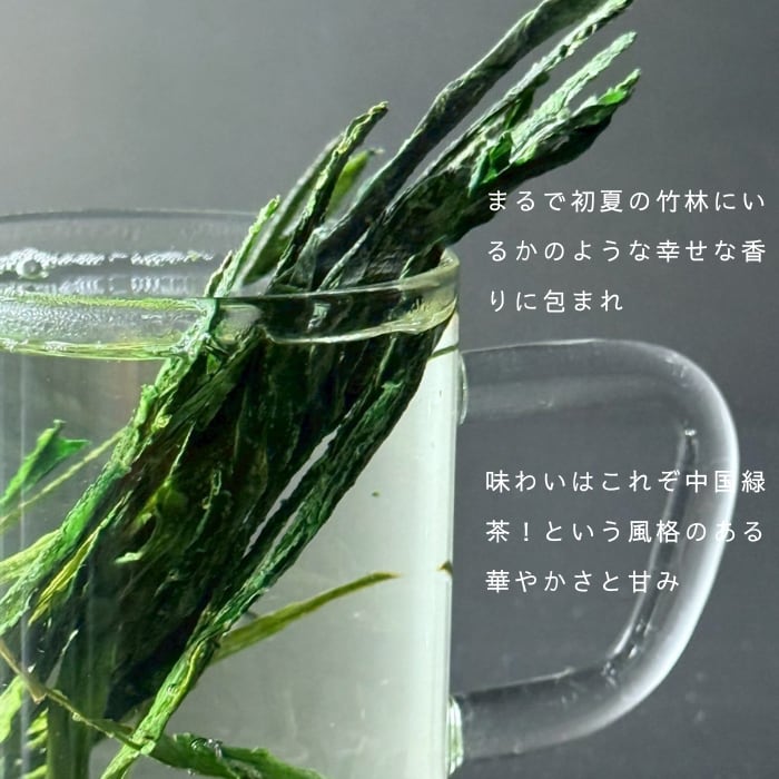 見た目のインパクトに反して、青竹を思わせる清々しい香りと上質な中国緑茶に現れる深い甘みと余韻という、超正統派の味わい。
