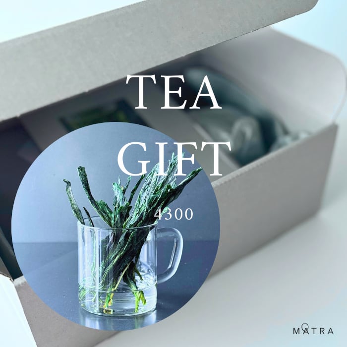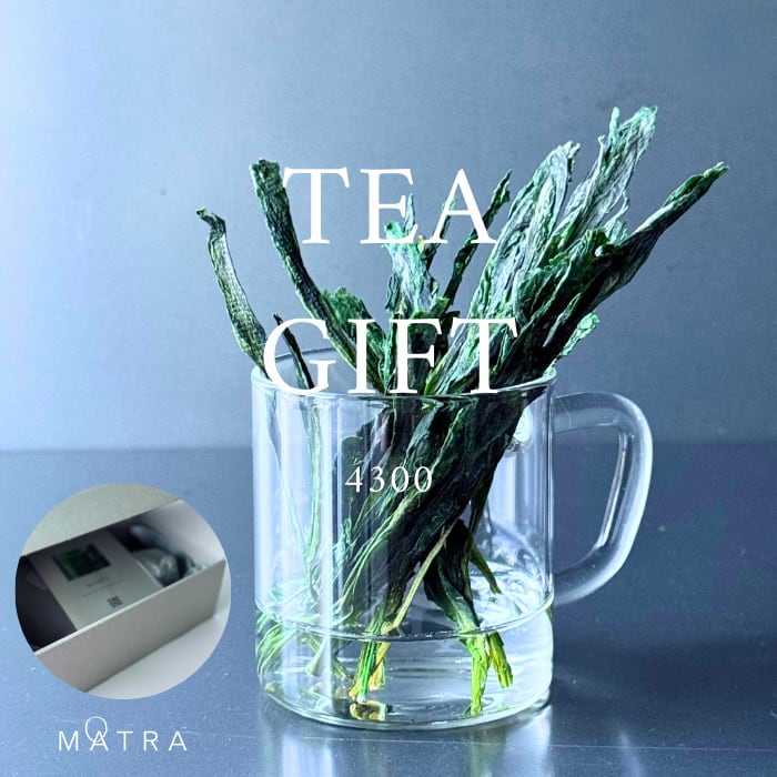 ミニマルで透明度の高い耐熱グラスで、たゆたうように広がる緑の葉を眺めながらお茶を楽しむ、贈り物にとてもおすすめのセットです。