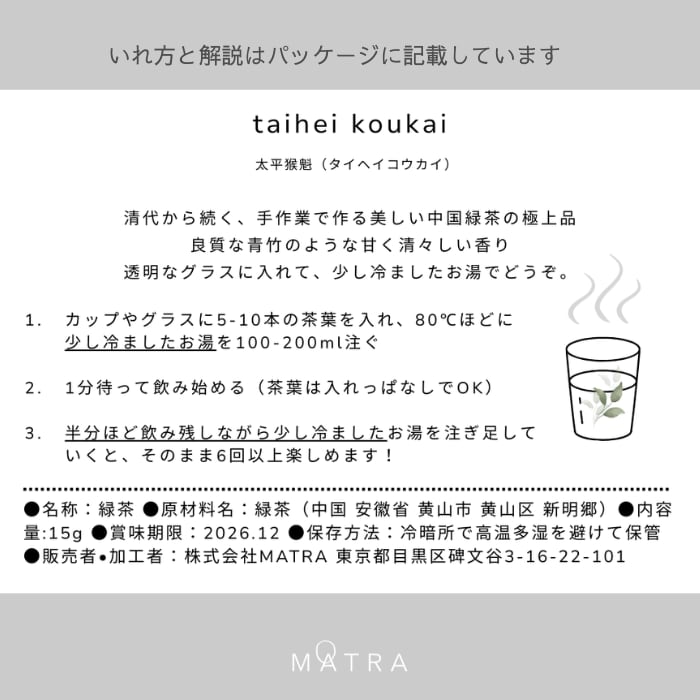 taihei koukai(太平猴魁)お茶をシンプルにグラスで楽しむために200年も前に生み出されたオンリーワンの個性を持つ中国緑茶。