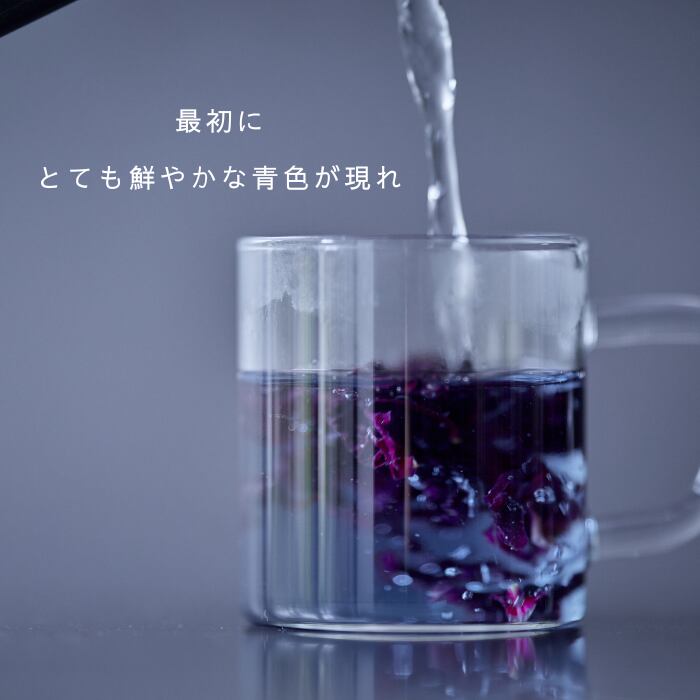 浸しておくとグレープジュースのような風味が現れ、しかも青から鮮やかなピンクへとグラデーションを描いで移り変わる色合いも楽しめます。