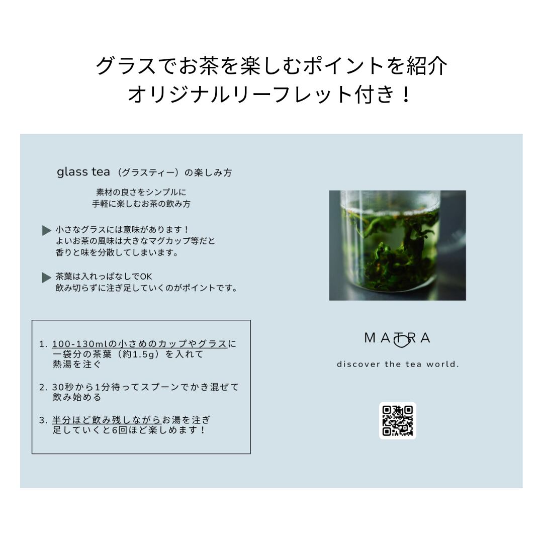 付属の美しくミニマルなグラス、BOROSIL VISION MUG ESP 120ml に花びらを4-5枚(約0.5g)入れてお湯を注ぐだけ。